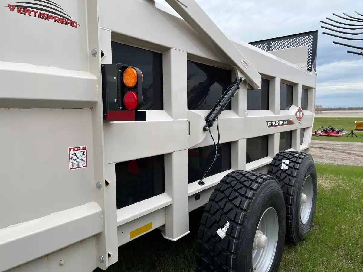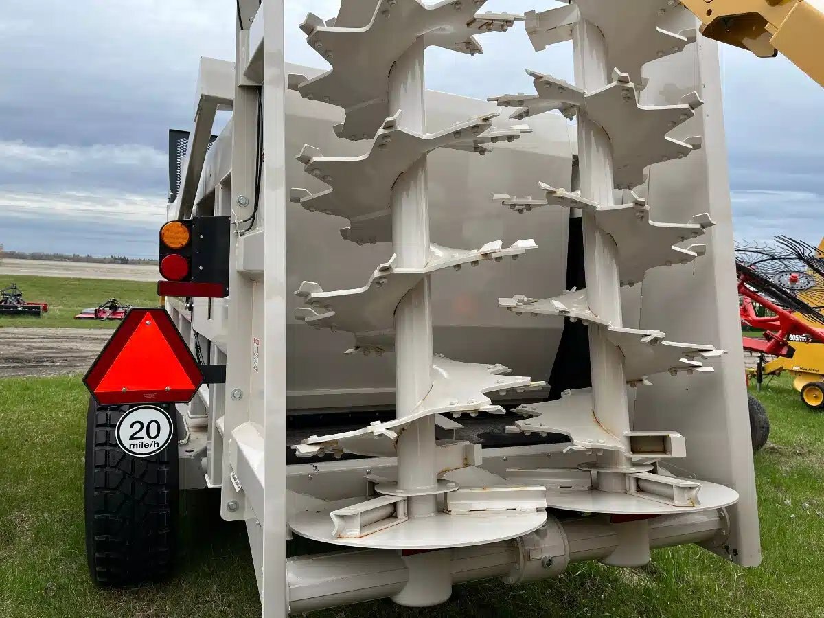 Heaped capacity 17m cubed, maximum net load 39,000 lbs. Overall length 358", overall height 127", overall tread width 125", loading height 97", unit weight 14,160 lbs. minimum PTO power 180hp, Propush design with Vertispread vertical beaters, heavier duty components, solid weld-in tongue cross braced for strength and rigidity, poly floor and sides minimize friction for exceptional machine cleanout, call for more details and price